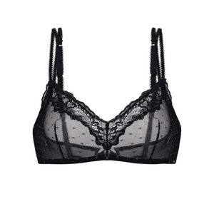 - Confeccionado con malla negra semitransparente con estampado de lunares dorados y ribete de encaje refinado en las copas, para un look femenino.