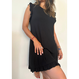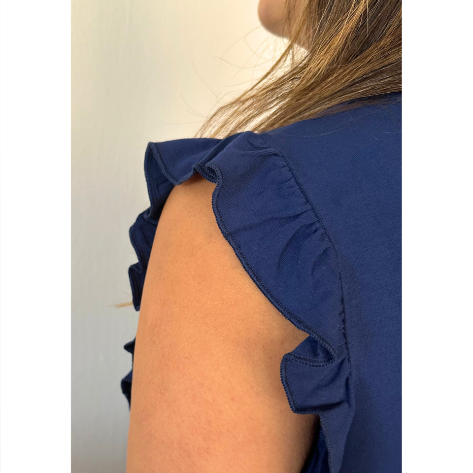 - Camisola lisa y sin mangas de corte holgado, con detalles de vuelos en sisa y ruedo.
