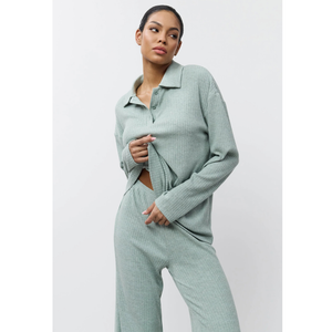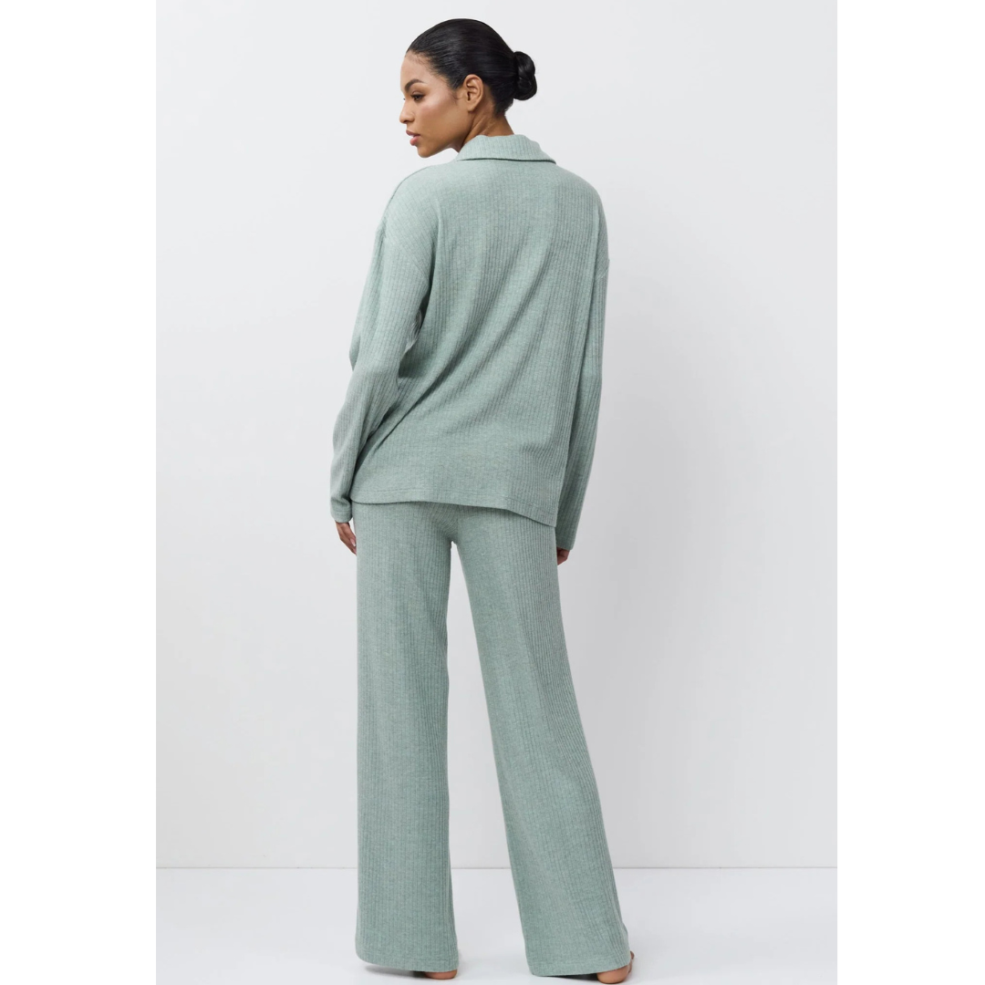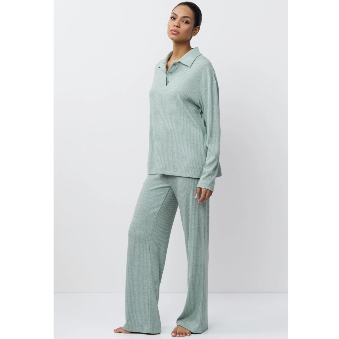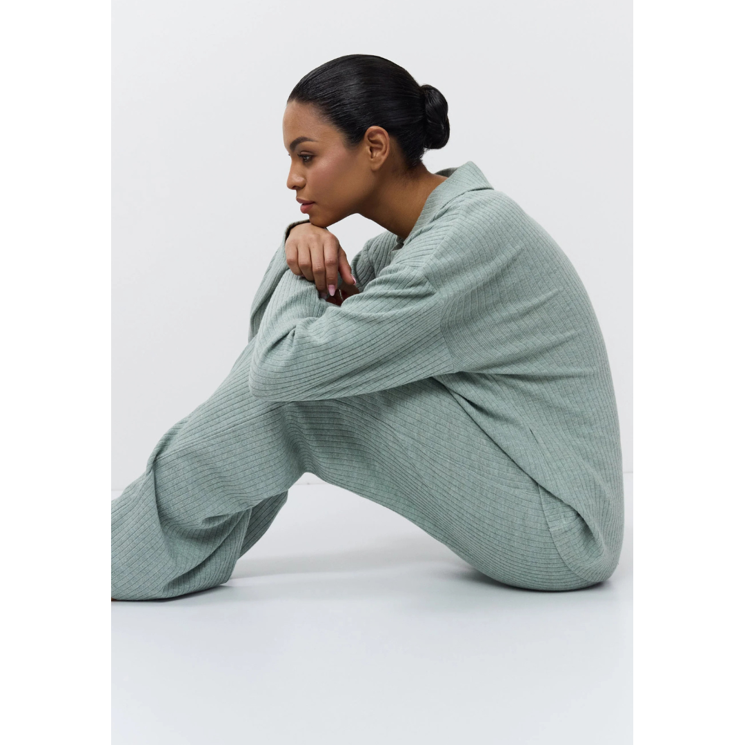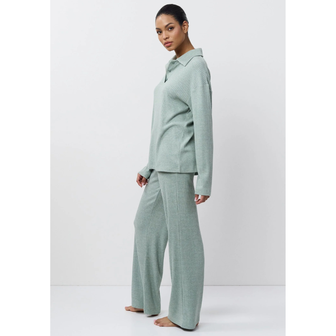 • Elegante conjunto de ropa de descanso con una silueta atemporal en verde claro.